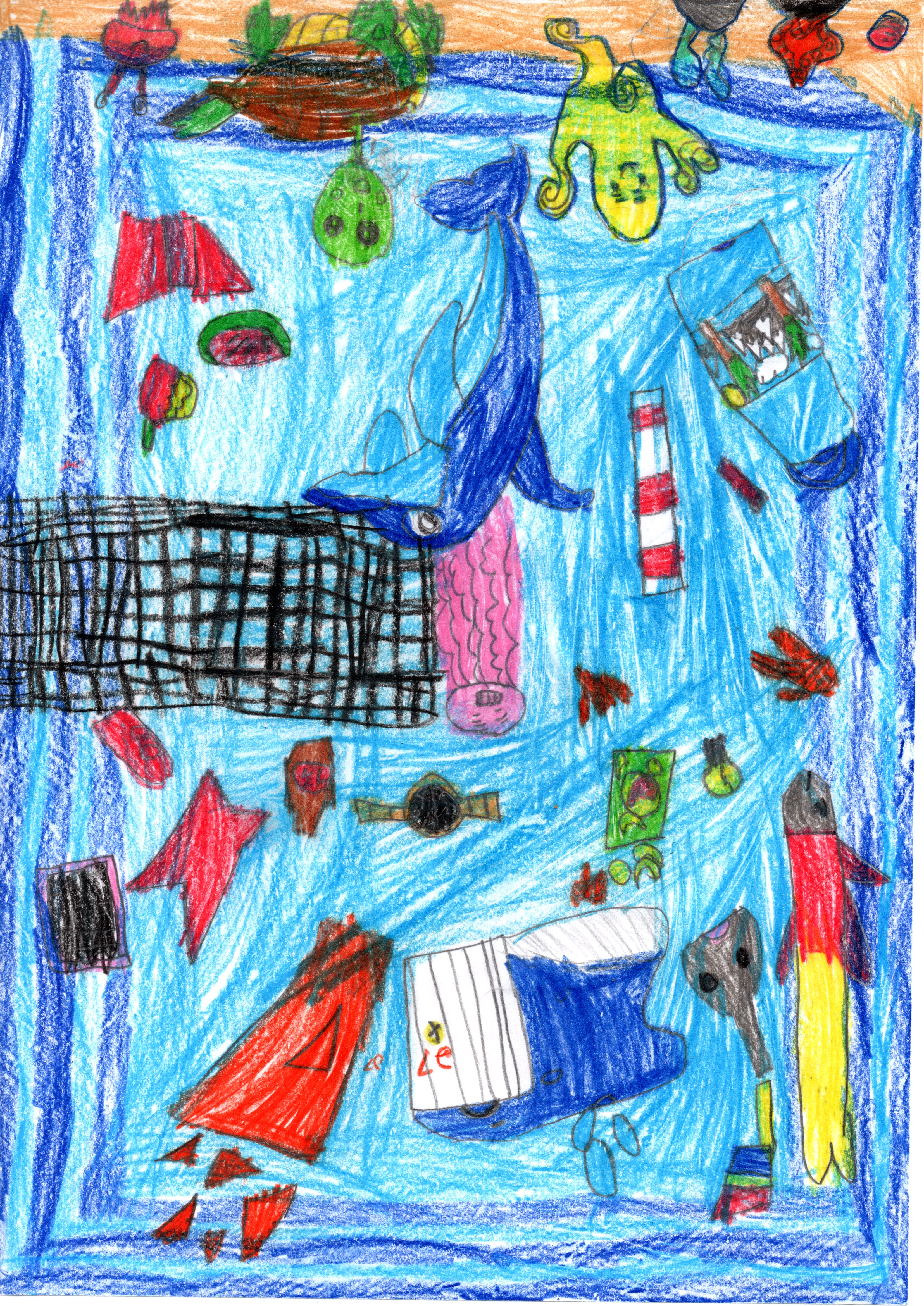Paralelamente, a criança integrou no desenho vários resíduos de origem humana, como redes, sacos deteriorados, embalagens de plástico e palhinhas. Estes elementos surgem associados ao espaço onde se encontram os animais, sugerindo a perceção do impacto negativo do lixo nos ecossistemas marinhos.
