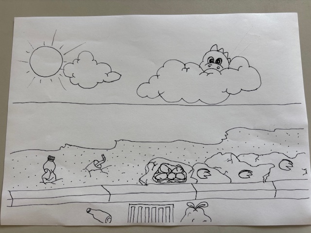 Nas arribas e camadas sedimentares da Praia de Cambelas encontram se registos dos ambientes jurássicos onde viveram dinossauros e outros vertebrados, incluindo pegadas, ninhos e ossos fossilizados que testemunham a passagem destes animais pela região. Uma vez que faz parte da história da localidade a presença do dinossauro, ninhos e pegadas na imagem funciona como um alerta simbólico incentivando à reflexão sobre a responsabilidade coletiva na proteção dos ecossistemas e na redução do impacto do lixo no planeta.