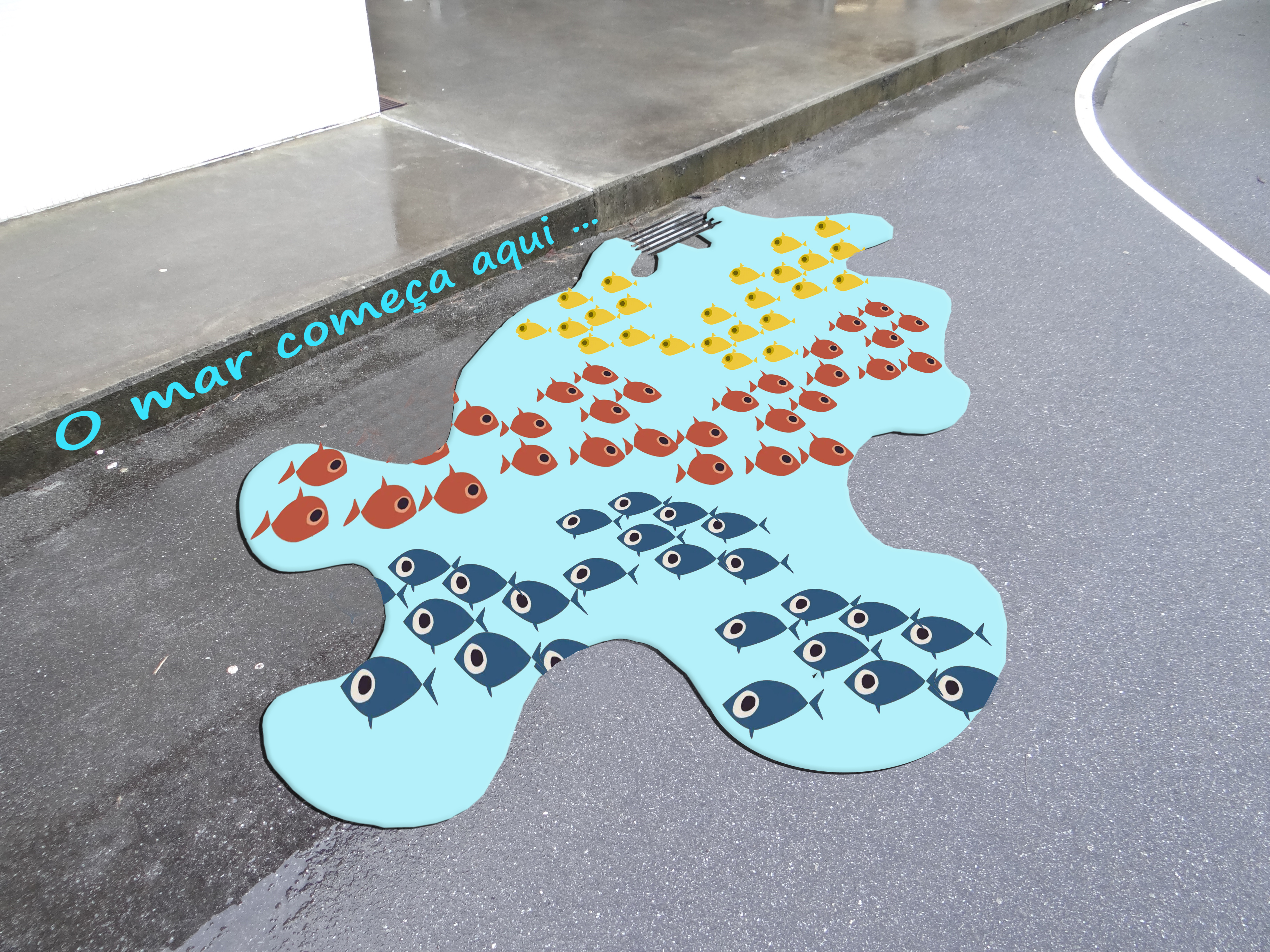A proposta de pintura que apresentamos representa uma grande mancha de água onde surgem vários cardumes de peixes de diferentes tamanhos, simbolizando a grande riqueza marinha existente e que constitui o sustento de muitas famílias do concelho.