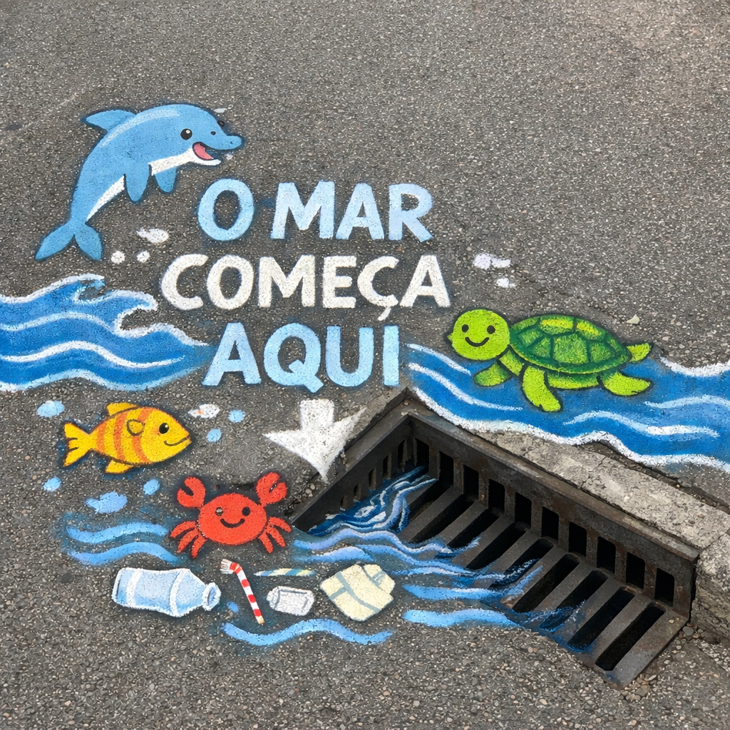 A imagem representa, de uma forma simples, a ideia de que tudo o que colocamos nas sarjetas pode ter impacto no mar, daí a importância de perceber que o mar começa em cada sarjeta e em cada "gesto nosso".